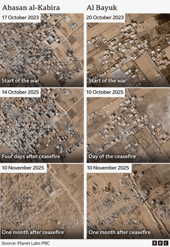 BBC Verify томонидан кўриб чиқилган сунъий йўлдош тасвирларига кўра, Исроил Қуролли Кучлари (IDF) назоратидаги бутун маҳаллалар бир ой ичида вайрон қилинган. Вайрон қилинган бинолар сони аслида анча кўп бўлиши мумкин, чунки баъзи ҳудудлар учун сунъий йўлдош тасвирлари мавжуд эмас.