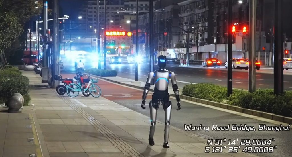 AgiBot томонидан эълон қилинган видеоларда роботнинг кумуш-қора рангли A2 модели велосипедчилар ва скутер ҳайдовчилари ёнидан ўтиб, йўл бўйлаб аста юраётгани, сўнг Шанхай манзараси бўйлаб тезроқ юришни бошлагани акс этган.