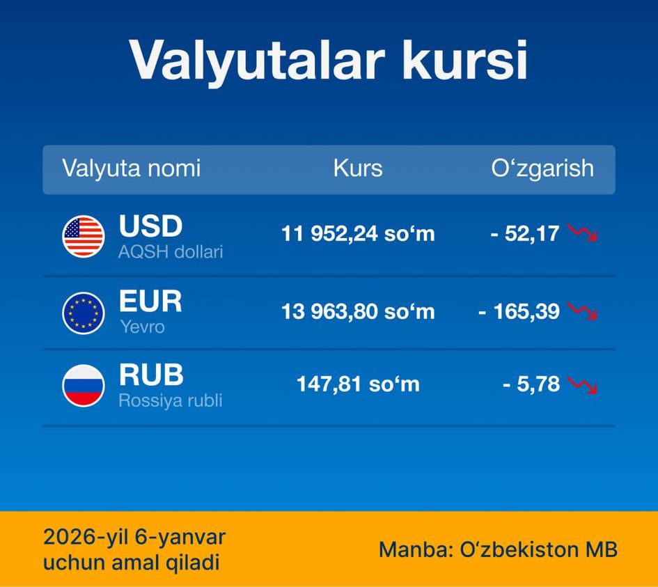 Марказий банк хорижий валюталарнинг ўзбек сўмига нисбатан 6 январда амалда бўладиган қийматини эълон қилди.