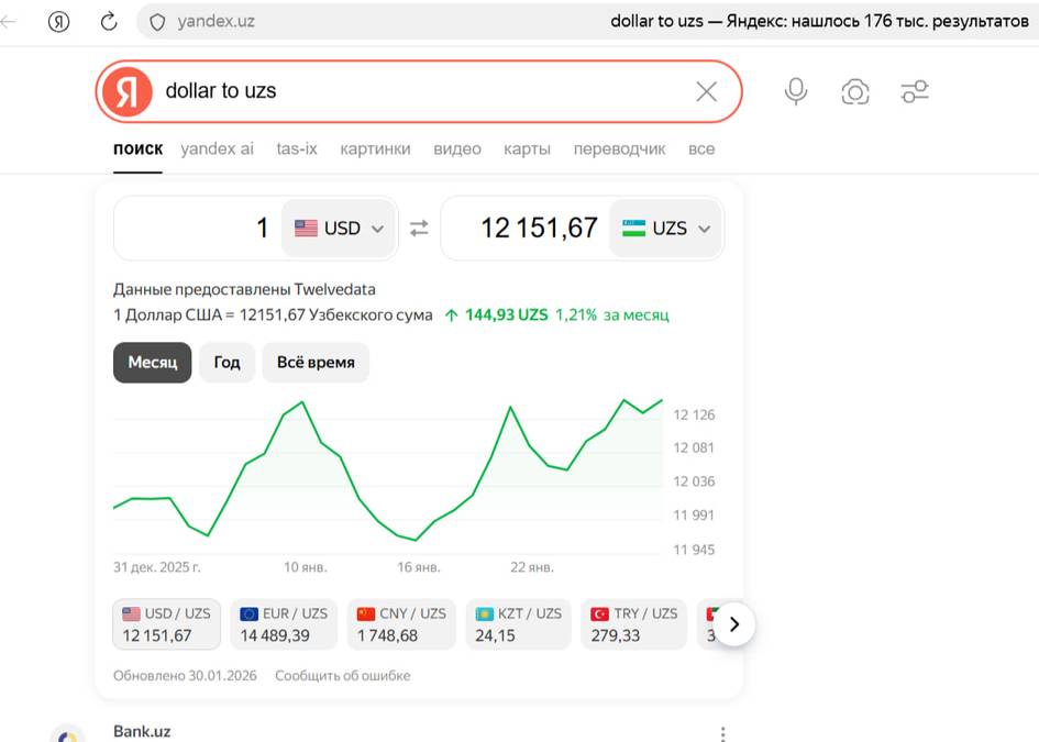 Регулятор валюта курси Марказий банк томонидан белгиланмаслиги, балки Республика валюта биржасидаги кунлик савдолар натижасида шаклланишини эслатиб ўтди. Курс ҳақидаги маълумотлар Марказий банк ва валюта биржаси расмий сайтлари ҳамда ижтимоий тармоқлардаги саҳифаларида мунтазам эълон қилиб келинмоқда.Маълумот учун, бугун, 30 январь куни Ўзбекистонда 1 АҚШ долларининг сўмга нисбатан расмий курси 12 199 сўмни ташкил этмоқда.